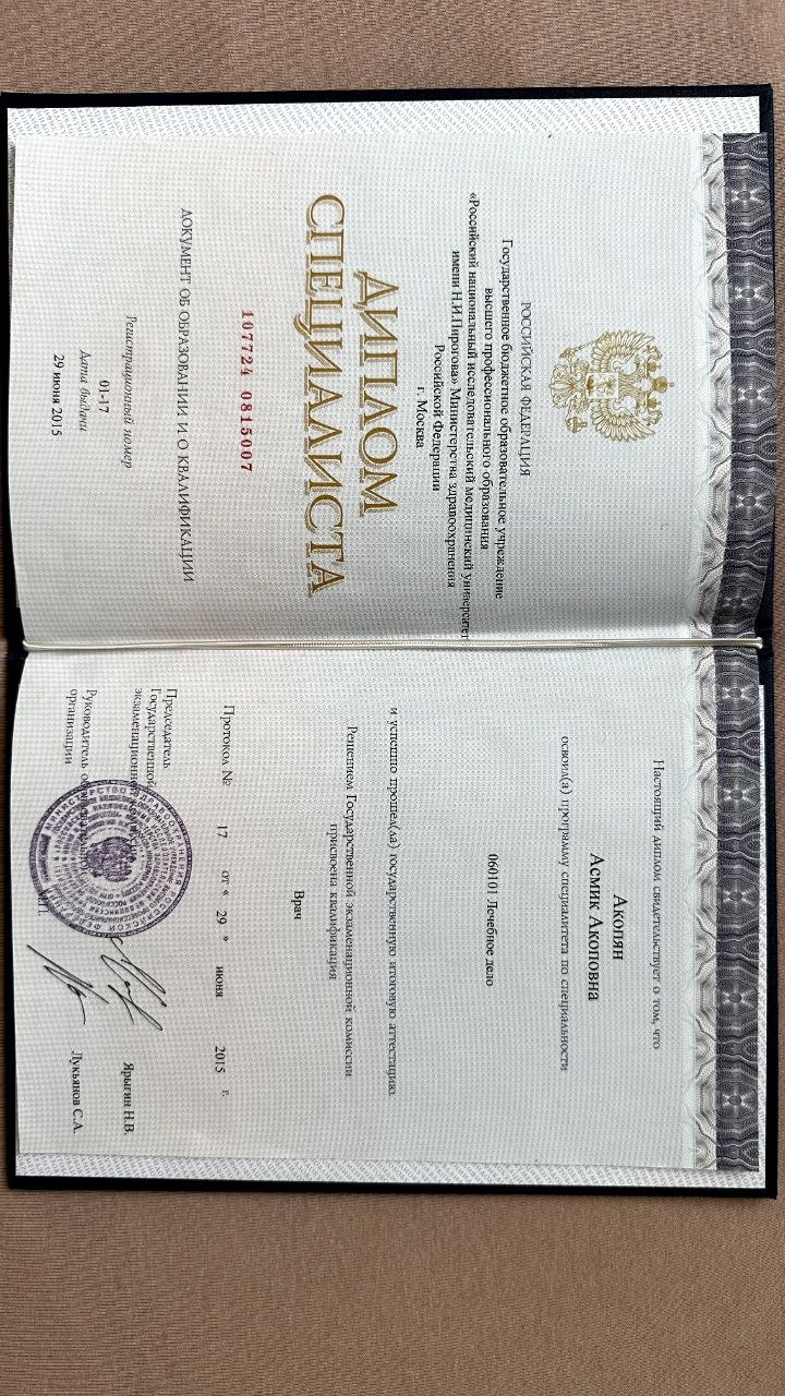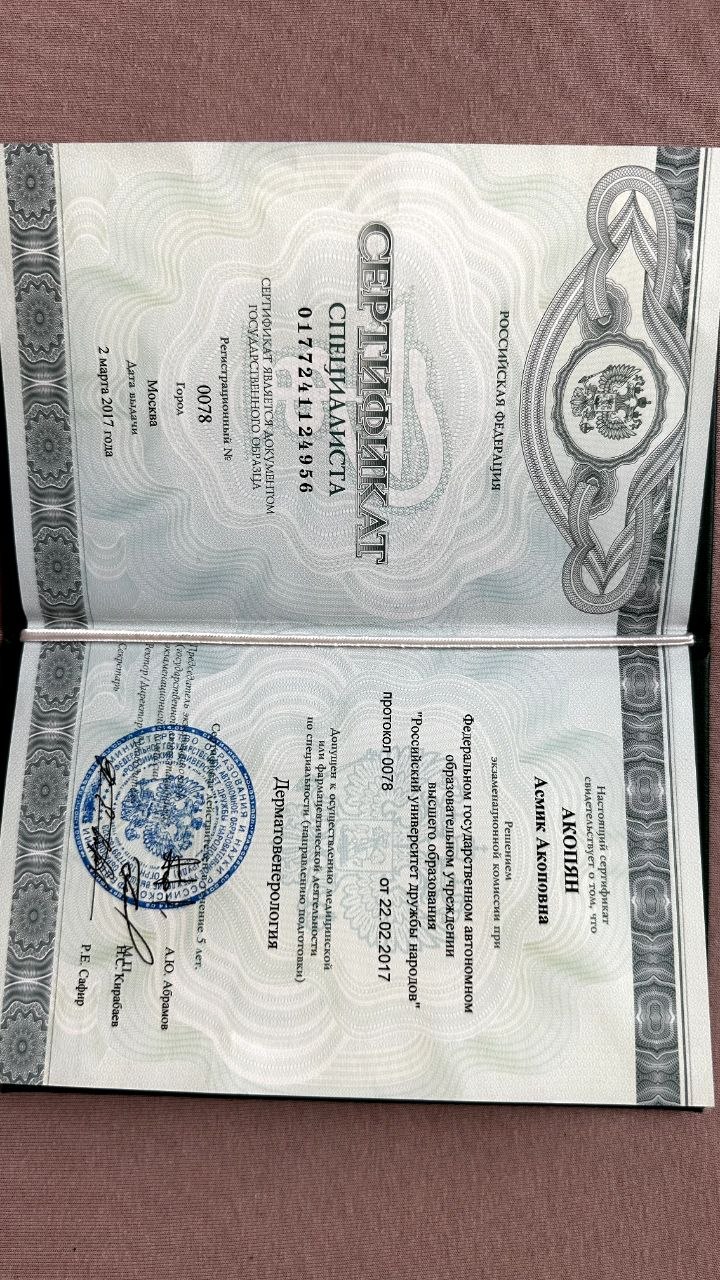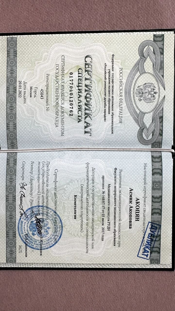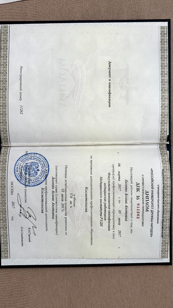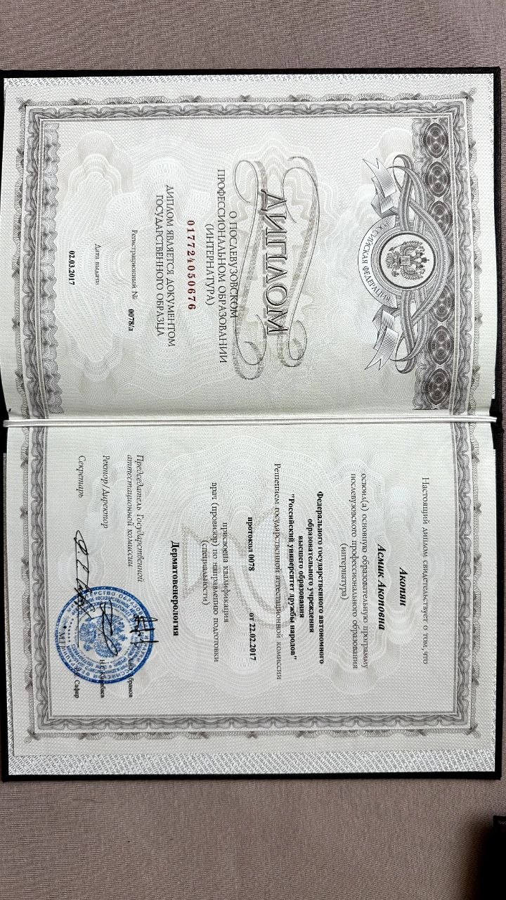 Асмик Акопян – высококвалифицированный врач-дерматолог, косметолог, специализирующаяся в области инъекционной и эстетической медицины, имеет обширный опыт работы и образование в ведущих медицинских учреждениях.