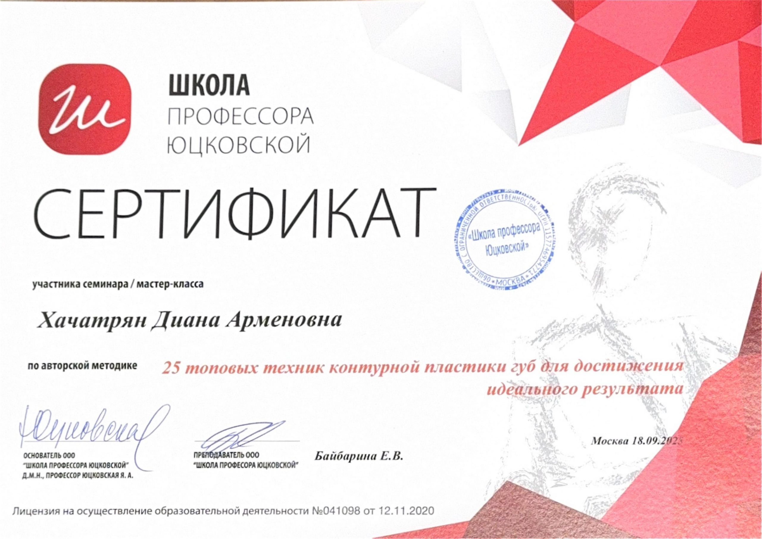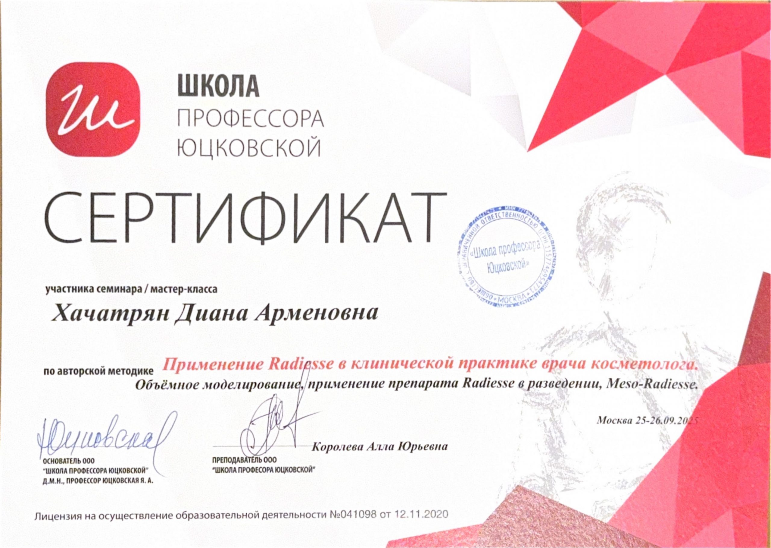 Диана активно участвует в научном сообществе и профессиональных организациях в области инъекционной косметологии, эстетической медицины и дерматологии. Она постоянно обновляет свои знания и навыки, посещая семинары, тренинги и конференции, чтобы быть в курсе последних тенденций и новых методик в своей сфере.