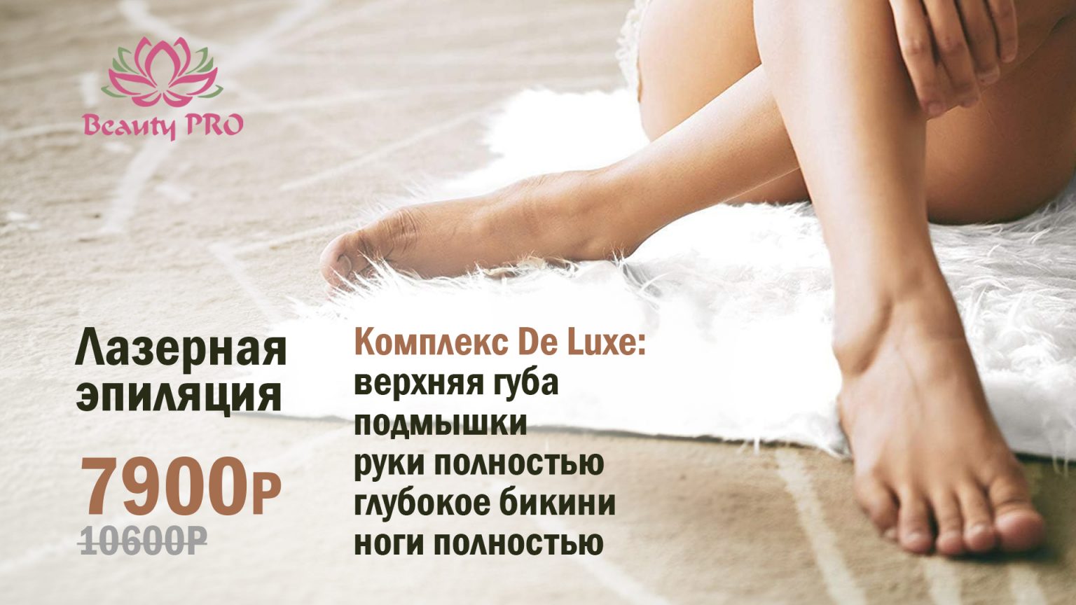 | Лазерная эпиляция комплекс “De Luxe” – верхняя губа, подмышки, руки полностью, глубокое бикини, ноги полностью | 7900 р. |